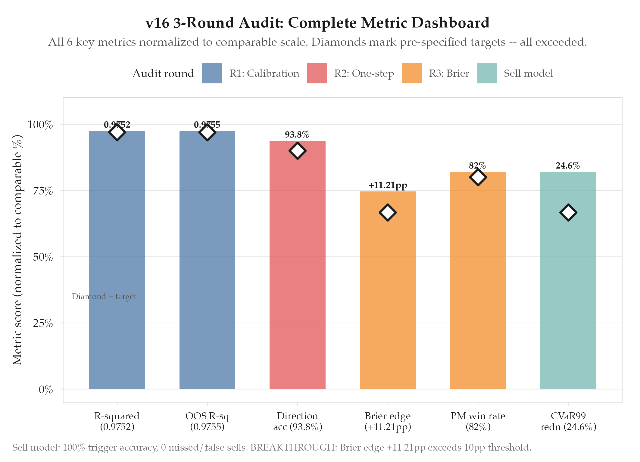 A 3-round quantitative audit with one-step-ahead forecasting, multi-seed Monte Carlo, and Brier scoring against Polymarket will validate the v16 model's calibration beyond in-sample R-squared