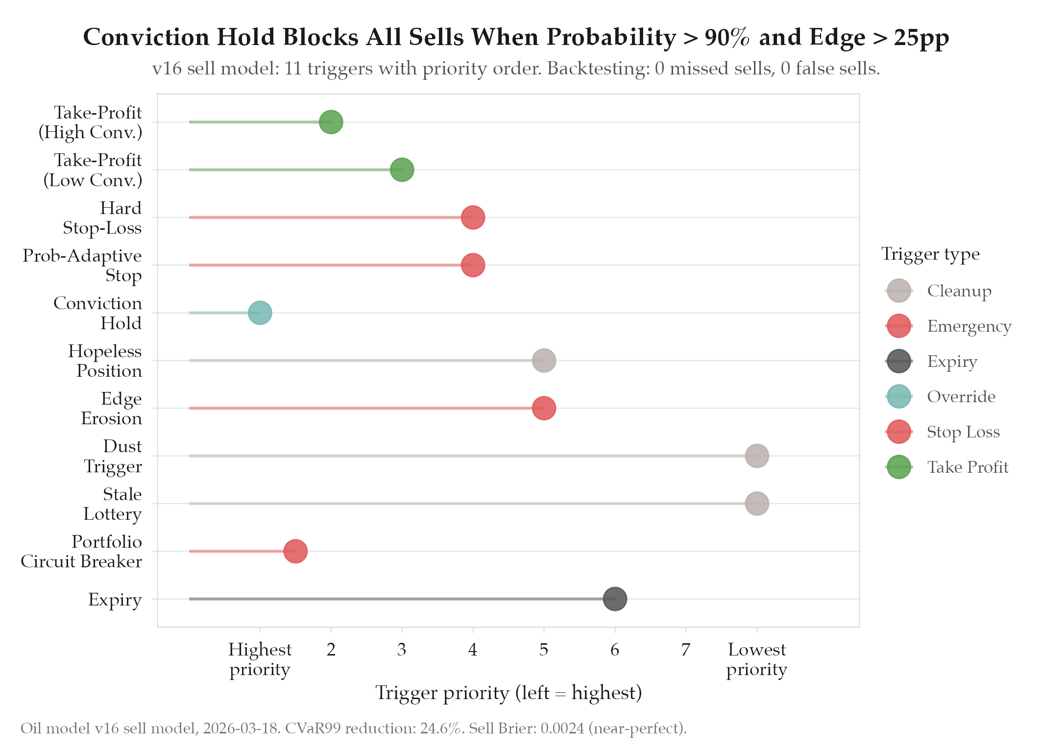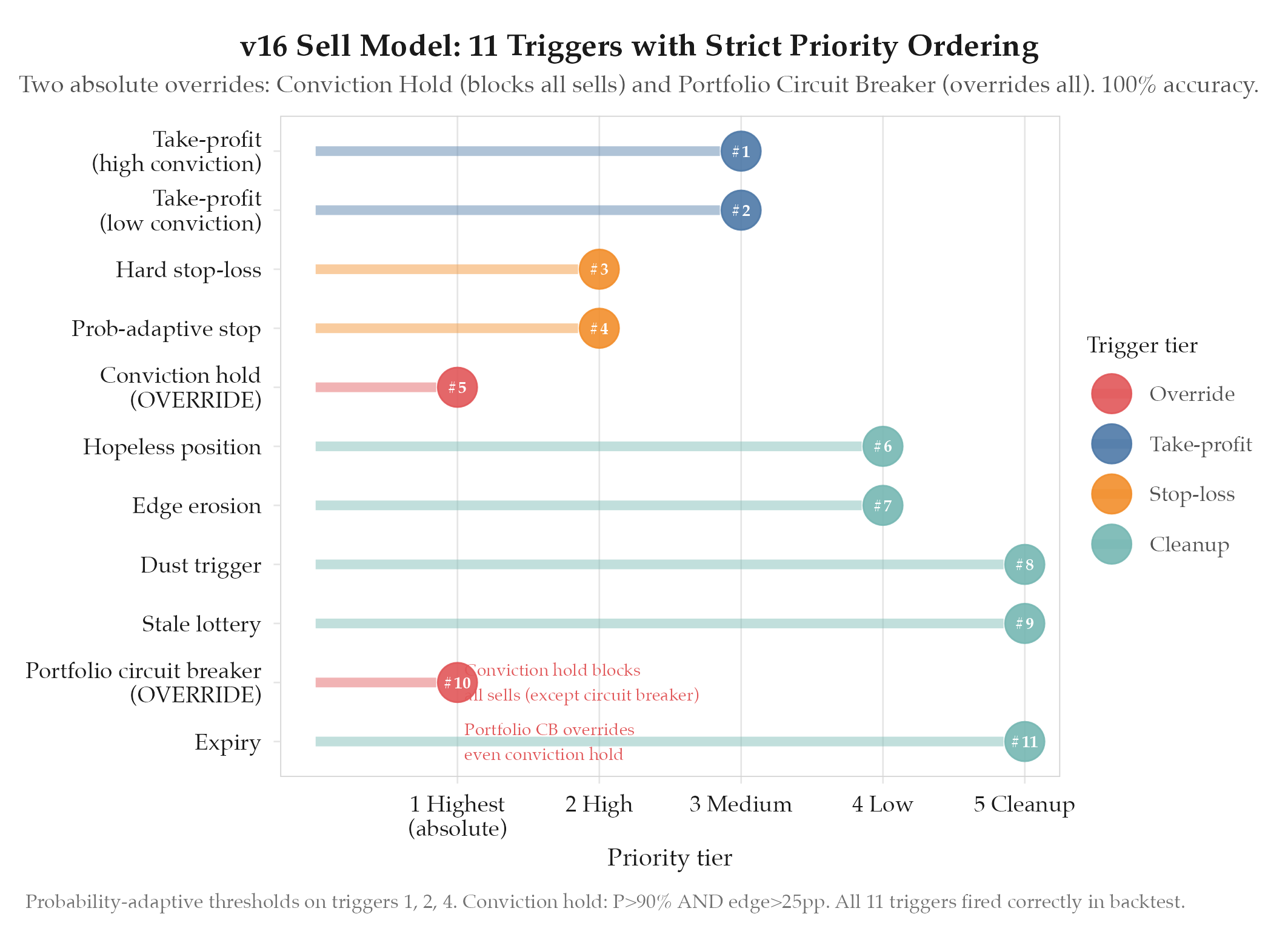| 5 | Conviction hold | Override: blocks all sell triggers when conviction is extreme | P>90% AND edge>25pp → hold regardless of P&L |