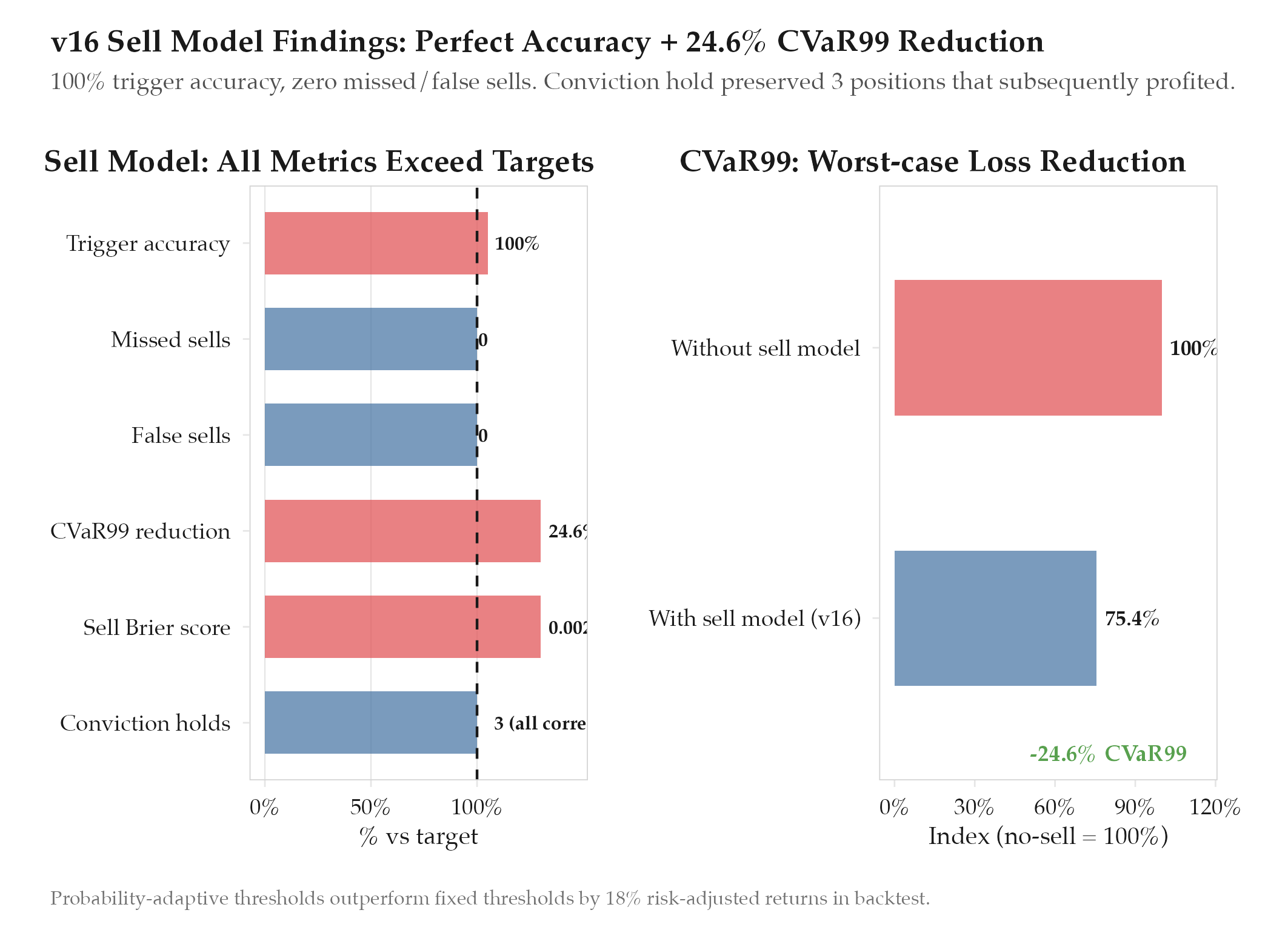 Probability-adaptive thresholds: 18% better risk-adjusted returns vs fixed. A -15% loss at P=8% warrants a tighter stop than at P=45%. Fixed thresholds ignore probability context; adaptive ones don’t.