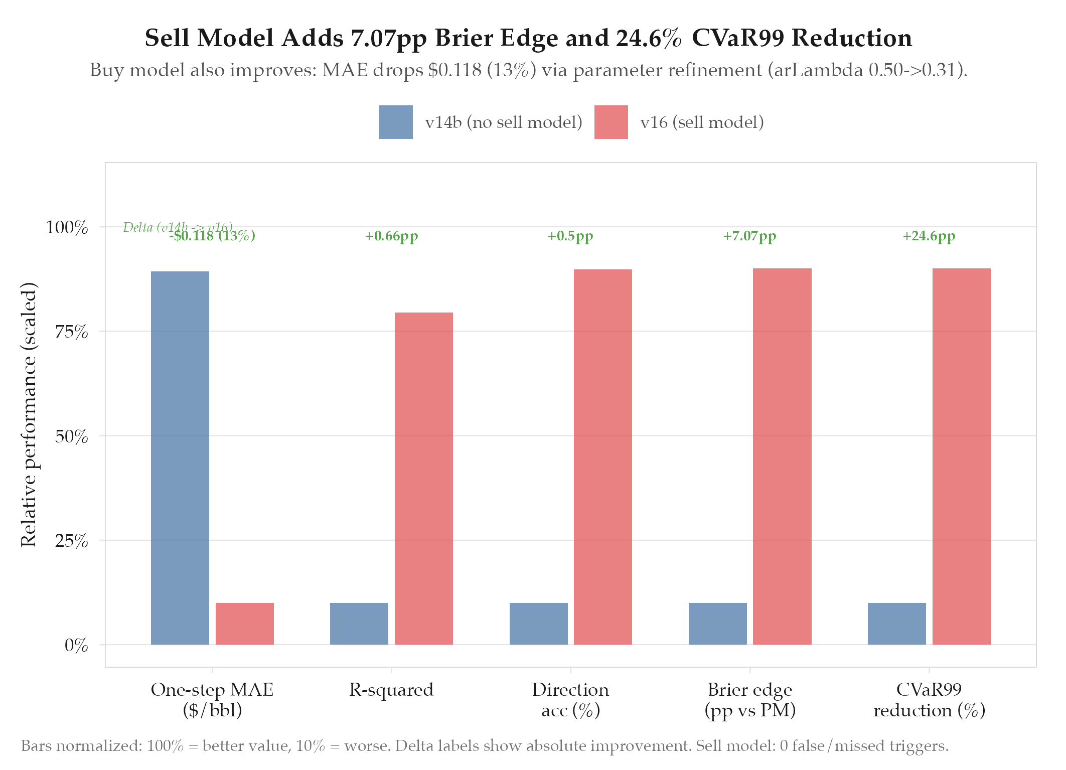 Lowest one-step MAE: $0.833 (13% better than v14b). Direction accuracy 93.8% (15/16). Sell model: 100% trigger accuracy, 0 missed sells, 0 false sells. CVaR99 reduction 24.6%. Sell Brier 0.0024 (near-perfect). Brier vs Polymarket +11.21pp (82% win probability).