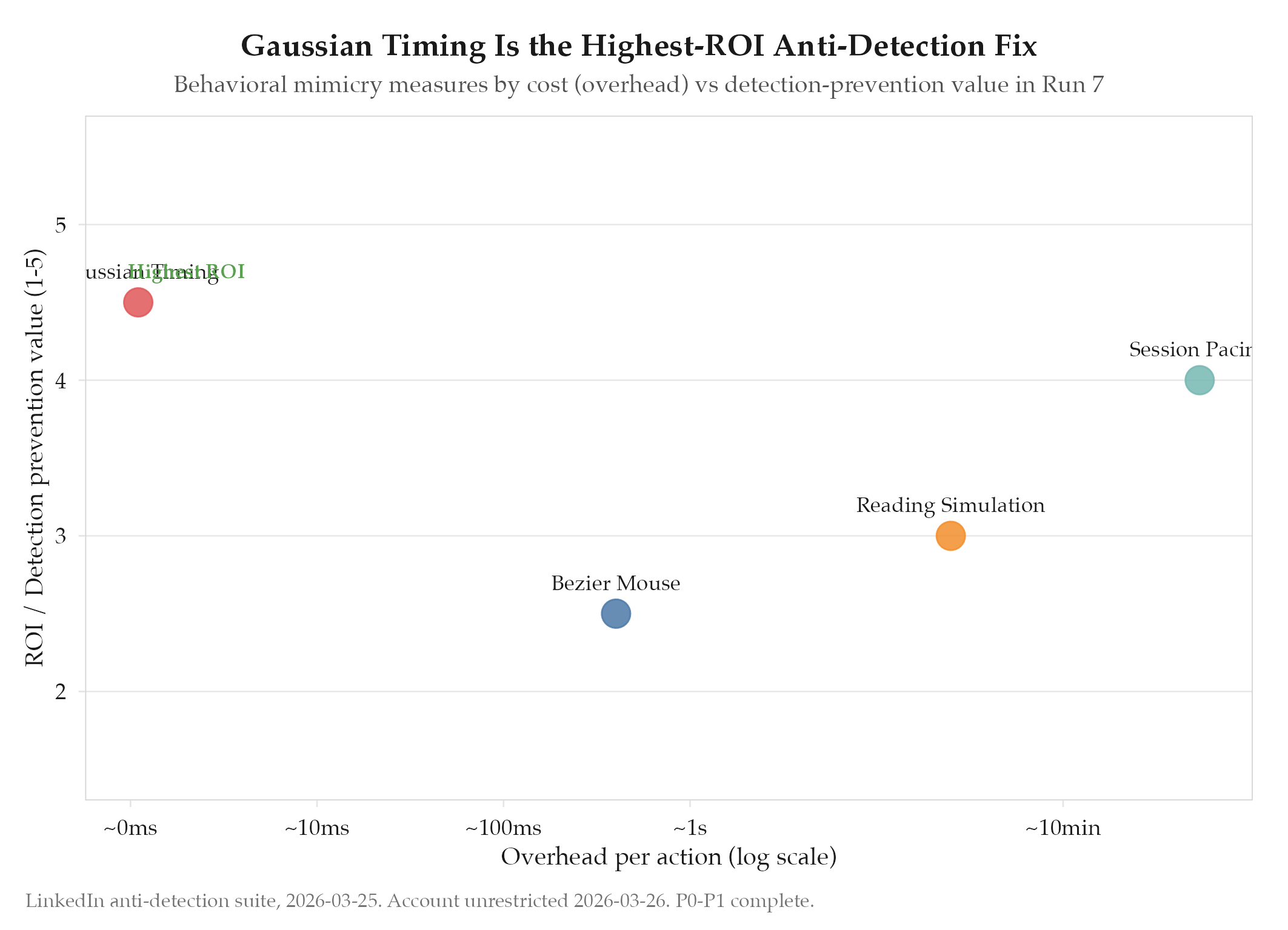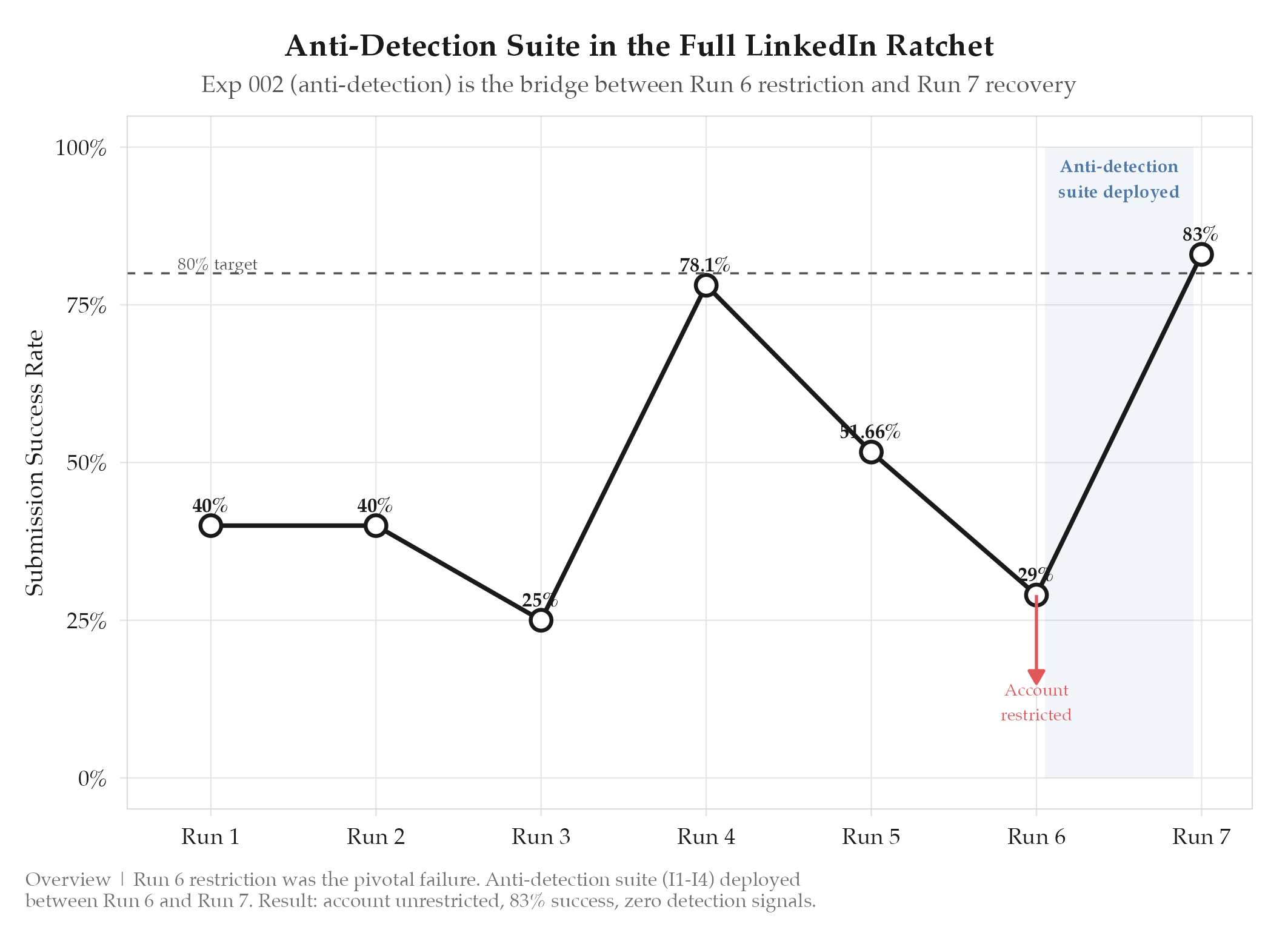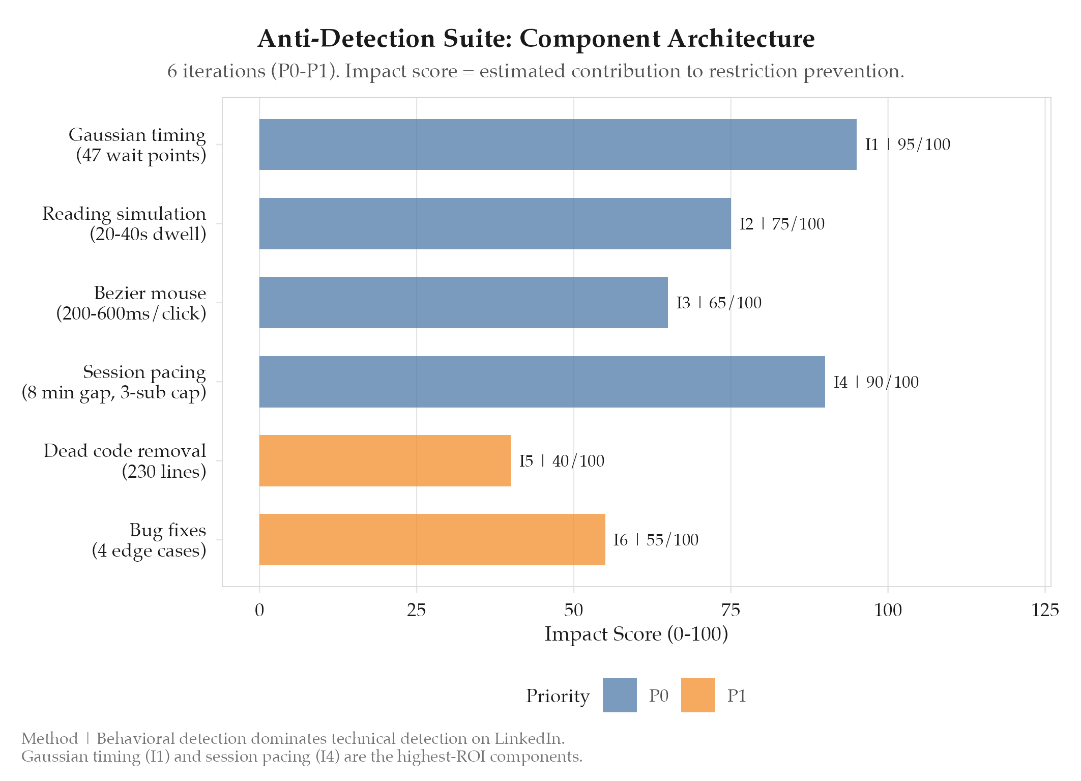 A multi-iteration anti-detection suite covering gaussian timing, reading simulation, mouse movement, and session pacing will prevent LinkedIn account restriction. The account restriction in Run 6 (experiment 001) demonstrated that LinkedIn’s detection system operates on behavioral signals rather than technical fingerprinting: the CDP-based shadow DOM access was undetectable, but the submission pattern (rapid-fire, no reading, no mouse movement) was flagged.