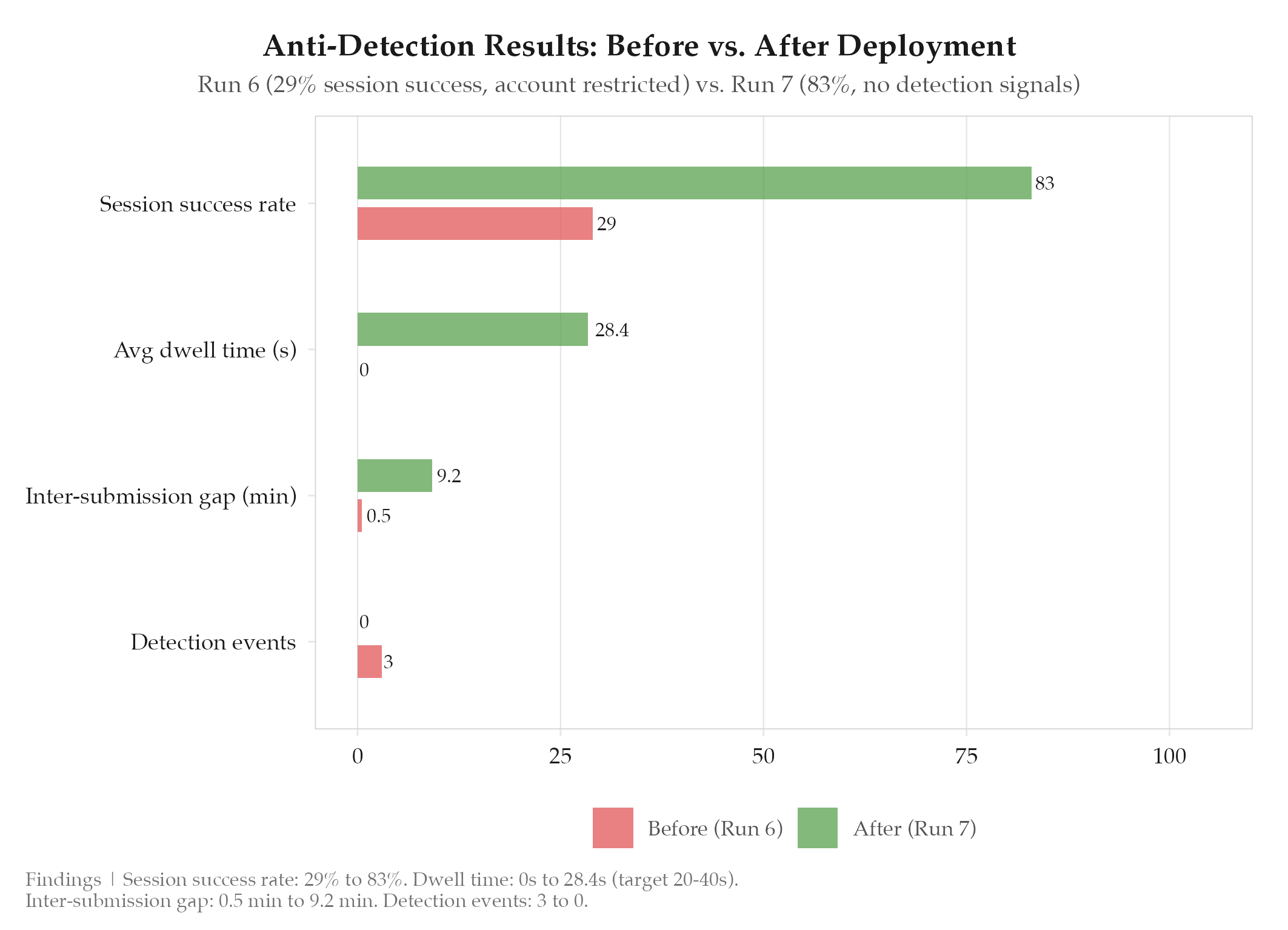 The safety rail is load-bearing. The 3-submissions-per-30-minutes hard stop is the most important single control. Even if all other anti-detection measures fail, the safety rail prevents the high-frequency pattern that LinkedIn’s system is clearly tuned to detect.