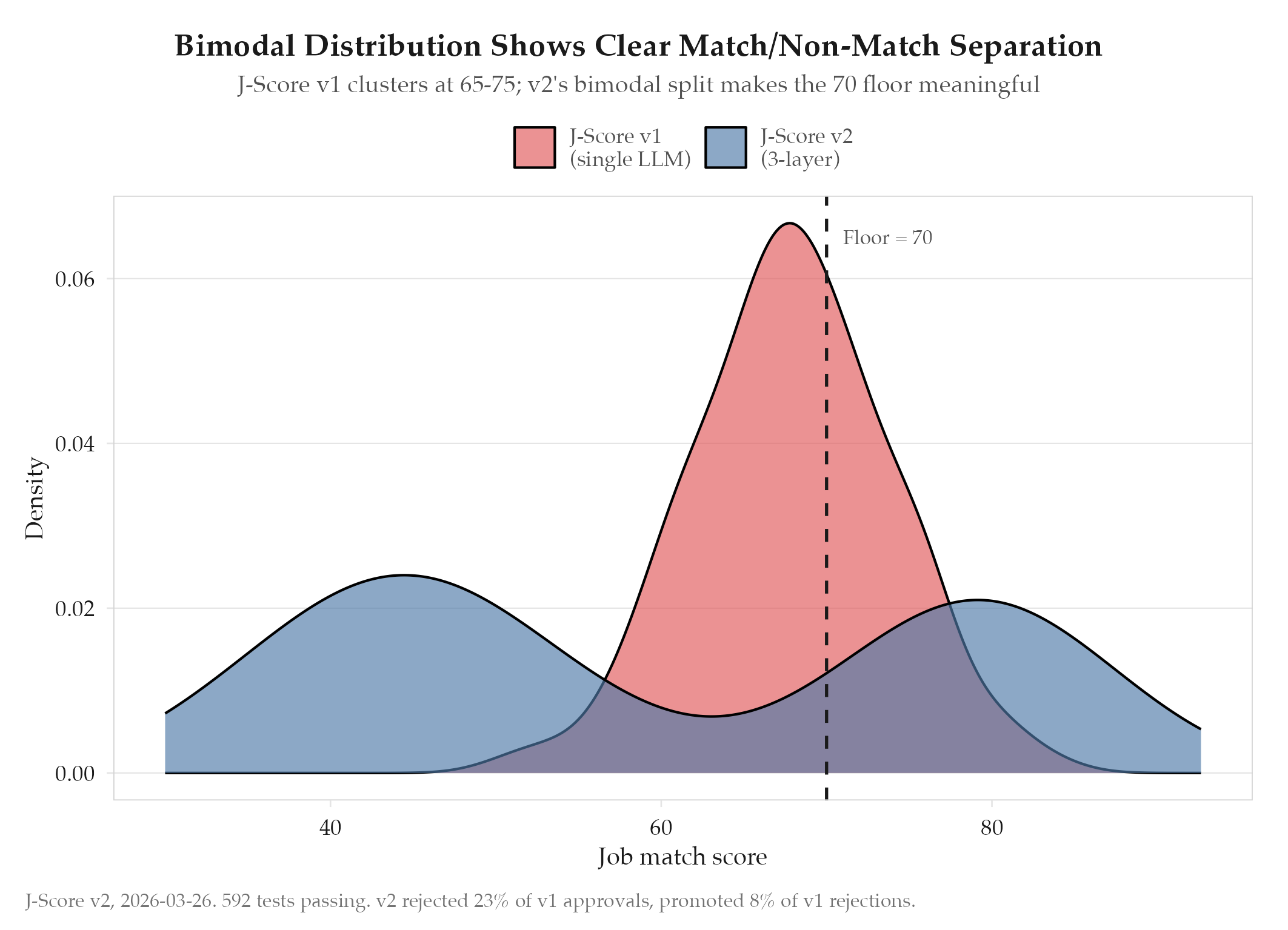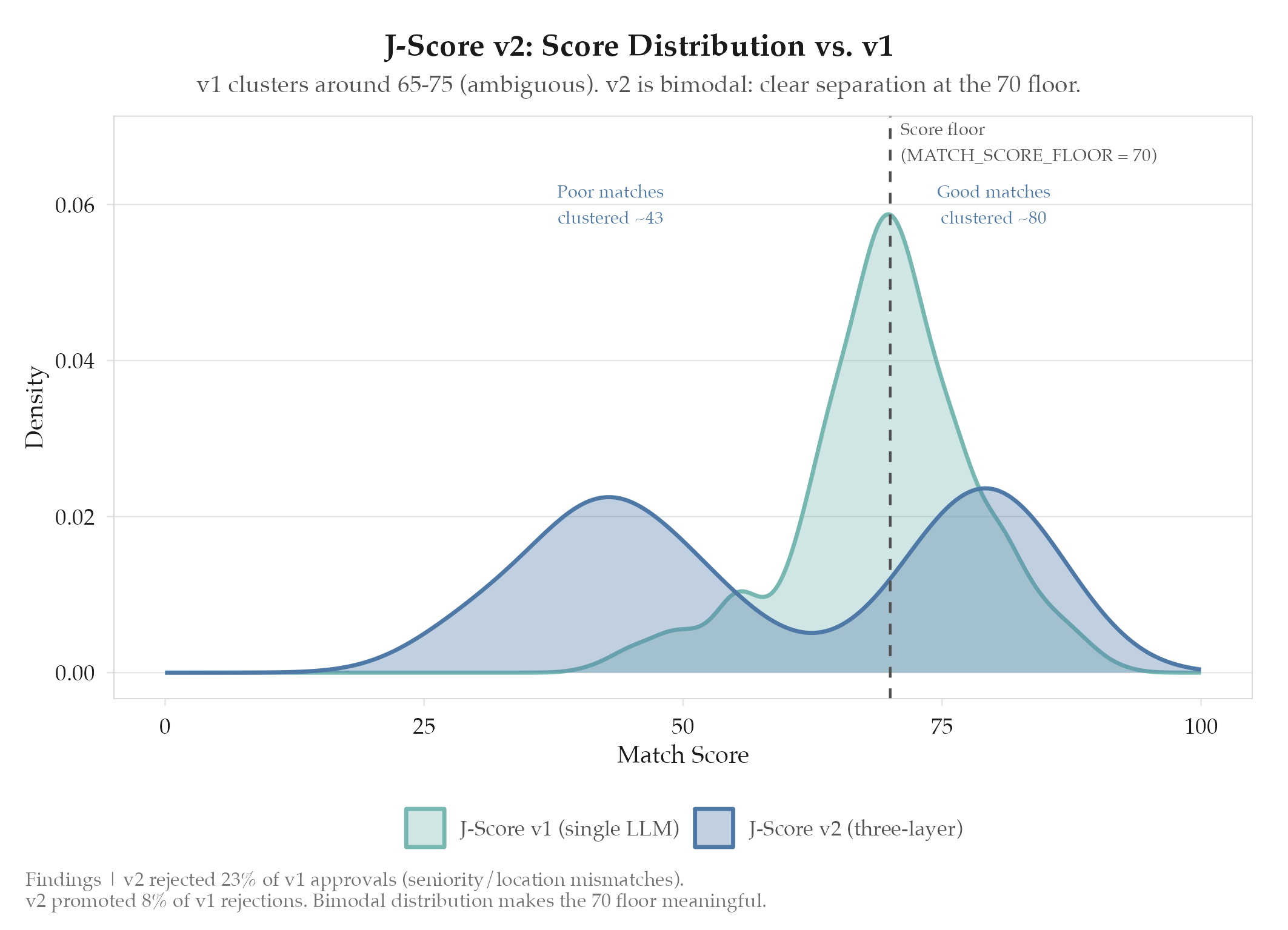 Bimodal distribution is the success signal. V1 clustered around 70 for borderline jobs: essentially random. V2’s bimodal (40-50 for poor matches, 75-85 for good) makes the 70 floor meaningful.