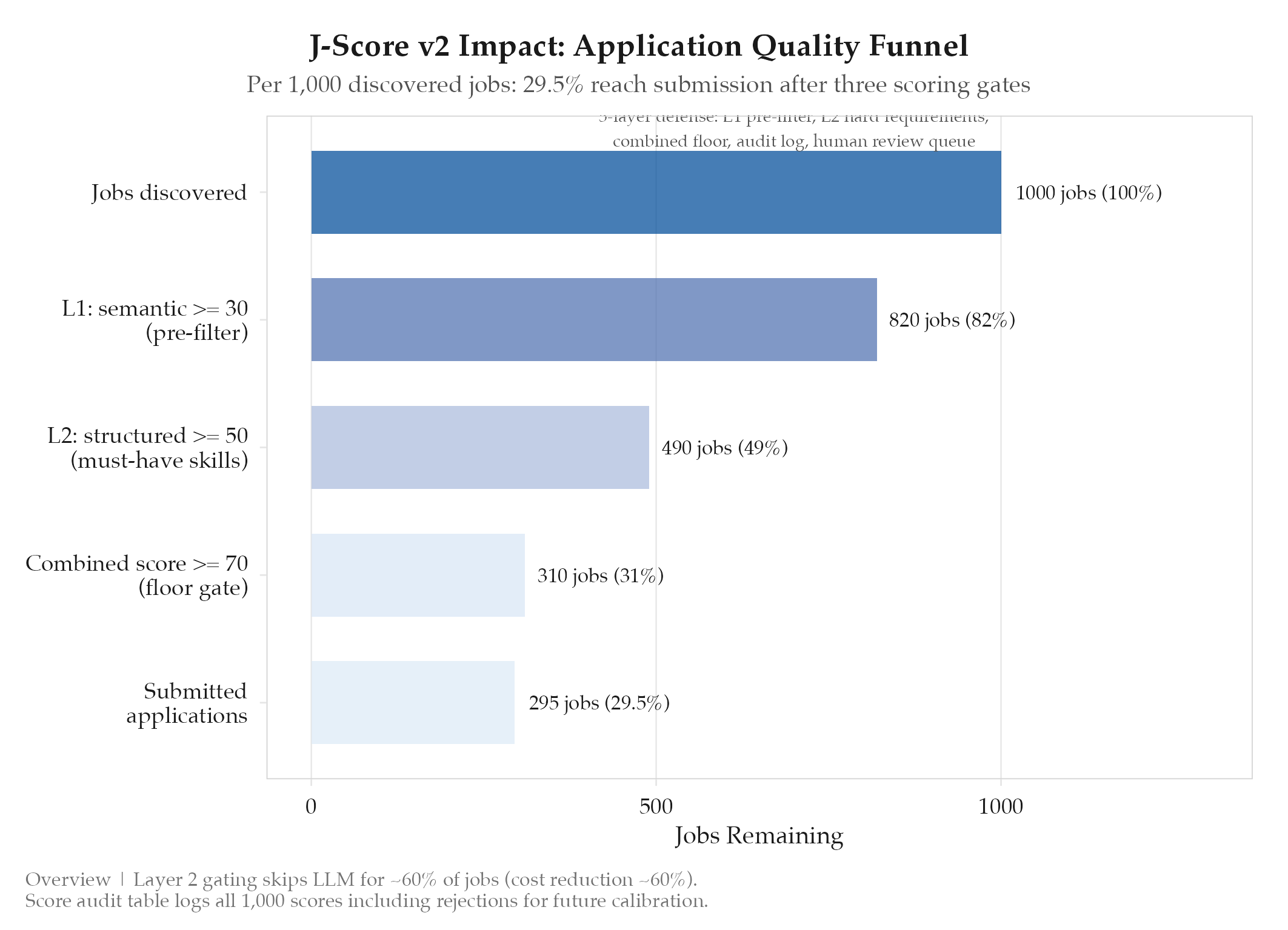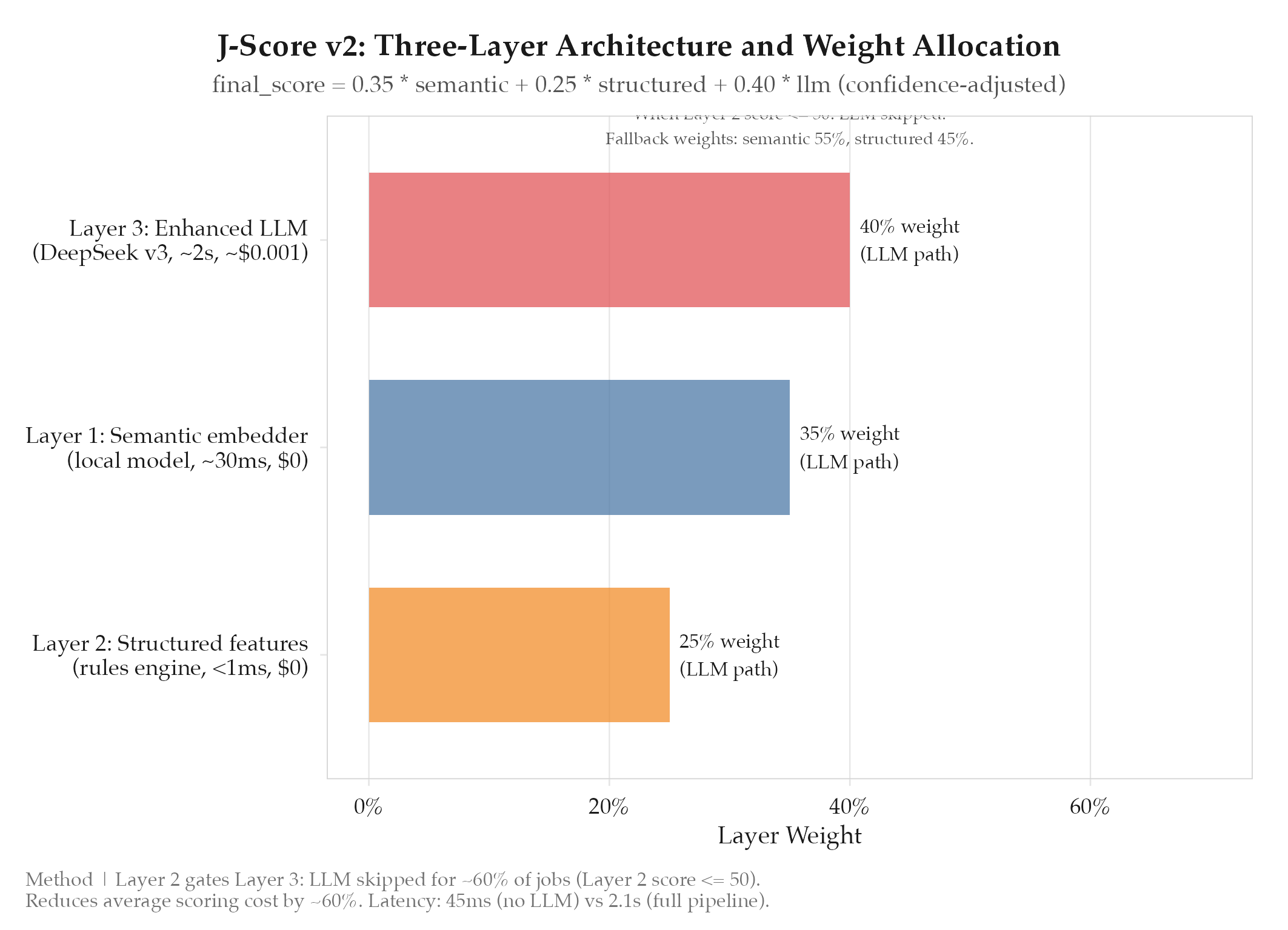- Layer 2 gating skips the LLM call for approximately 60% of jobs, reducing average scoring cost by ~60%