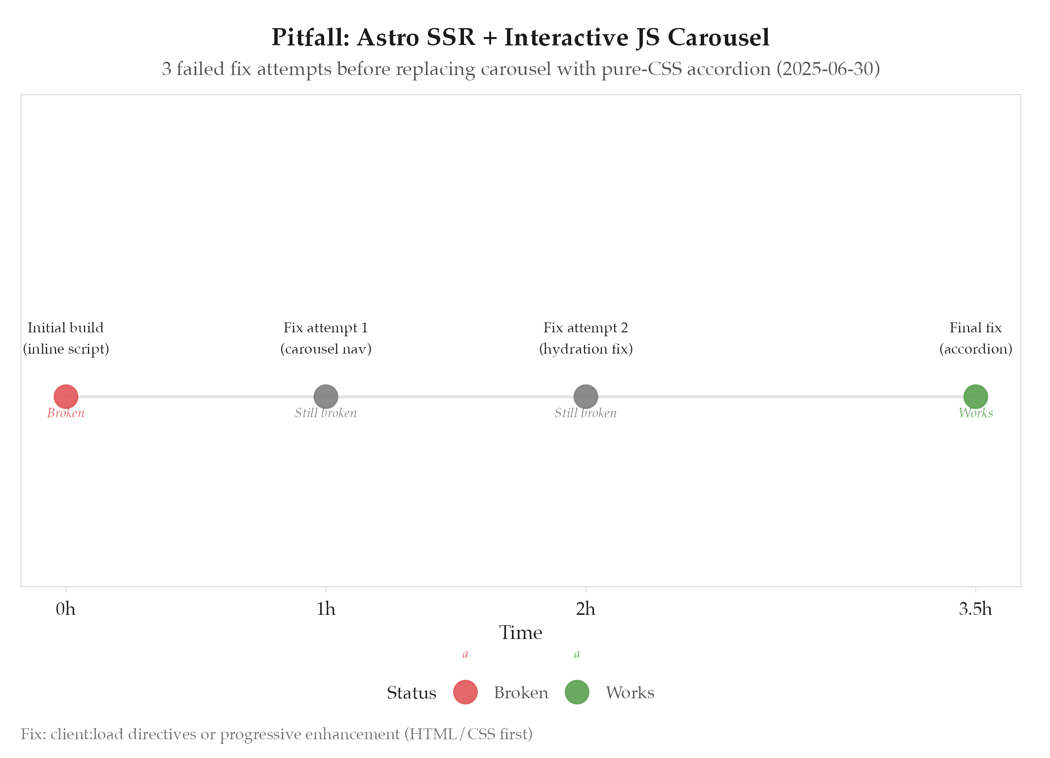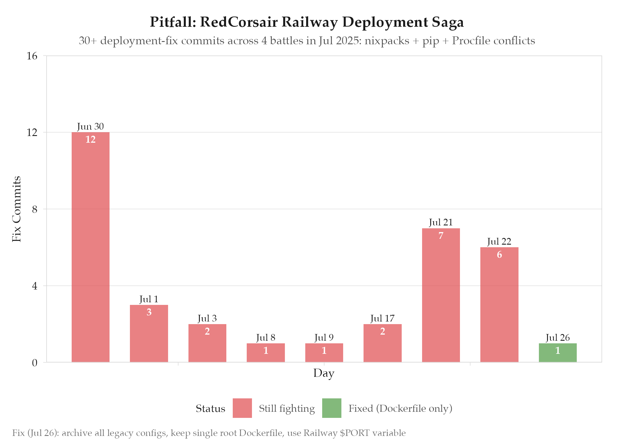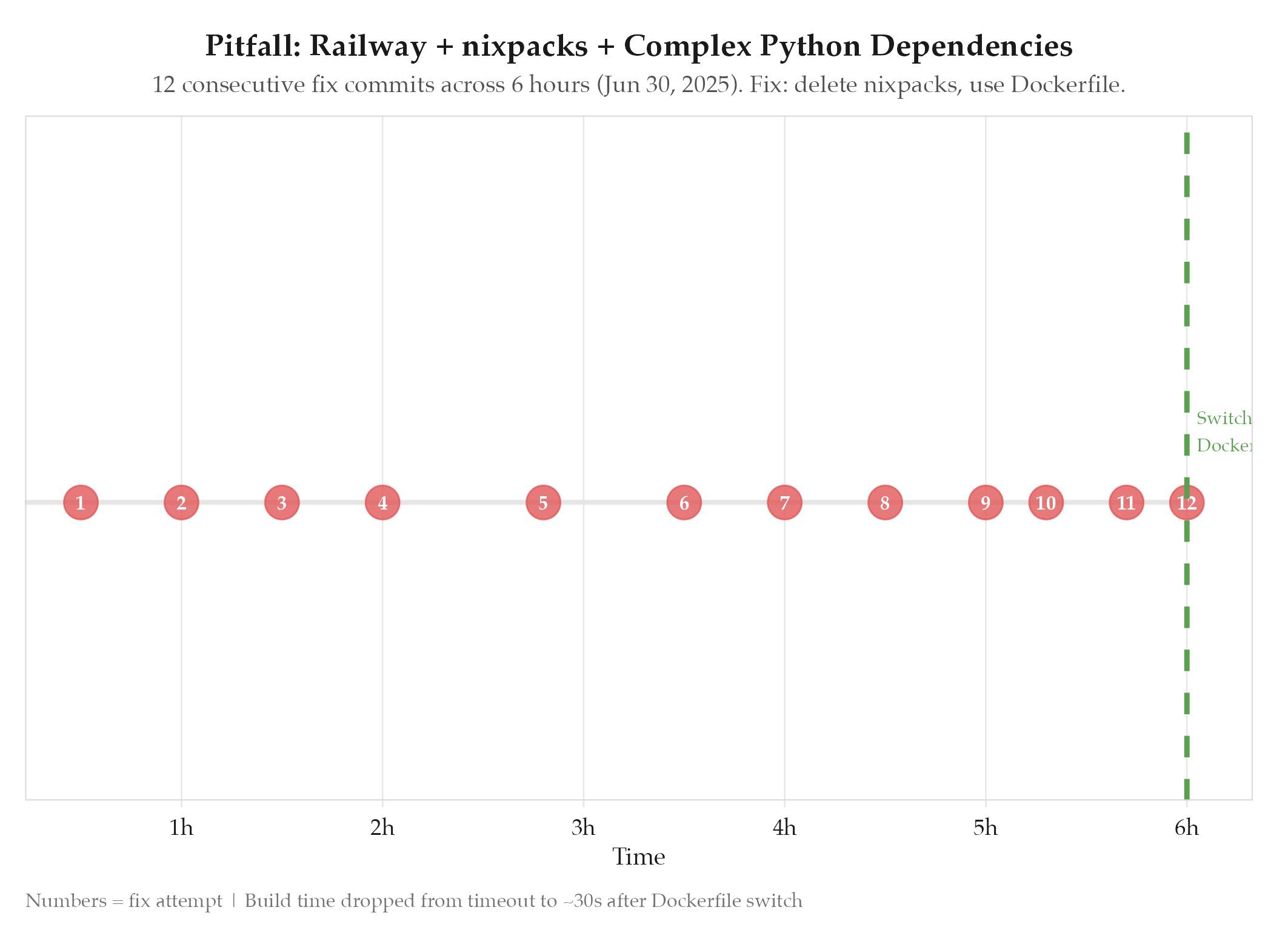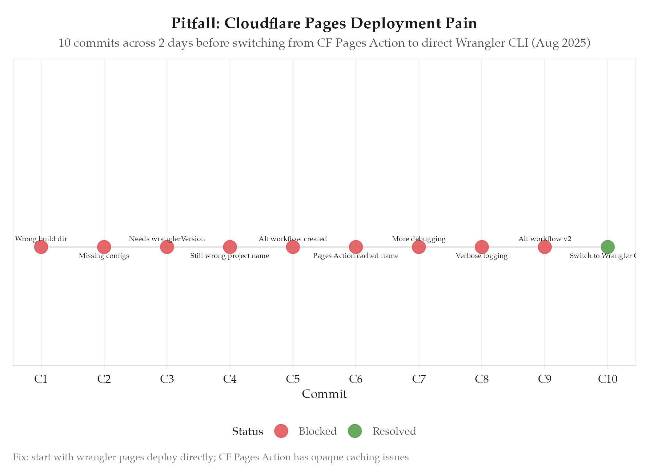 Documented failures with root causes and redemption arcs. Every pitfall connects back to the experiment or breakthrough it eventually enabled.